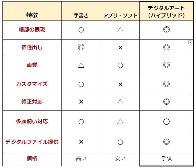 ここでは、ペットイラスト作りの特徴を比較し、それぞれのメリット・デメリット、をプロが解説します。