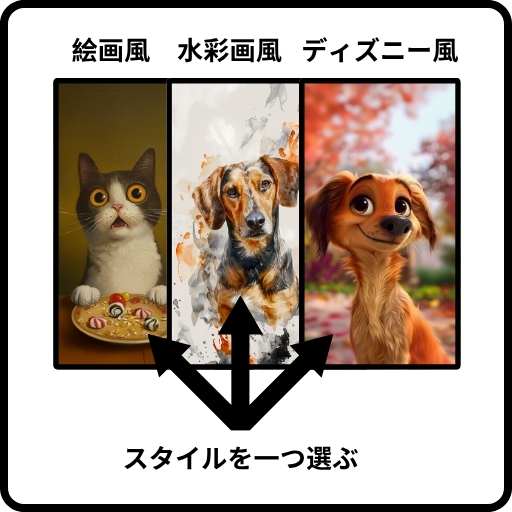 - スタイル: ペットの特徴を捉えた似顔絵アートを、人気のスタイル(ディズニー風・水彩画・絵画風)で作成します